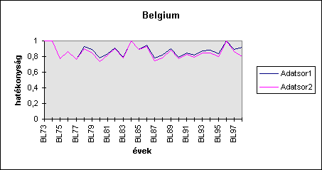 E helyen - eltekintve a DEA módszer szabatos leírásától (vö. Bunkóczi, Pitlik, 1999) - csak az alkalmzás legfontosabb tulajdonságait célszerû ismertetni. A Data Envelopment Analysis módszere pl. a búza-terméseredmény (y, kg/ha) és az ezt meghatározó technológiai lépések (xi - jelen esetben NPK, mész kg/ha, ill. energia ECU/ha) alapján képes a leghatékonyabb (output-input arányokat mutató) objektumok (oszág-év) kijelölése nyomán a többit ezekhez hasonlítva rangsorolni. A végzett számítások egyrészt hektáronként, másrészt országos összes termelési és ráfordítási volumenek alapján az alábbi ábrákhoz hasonló hatékonyság-változási idõsorokra vezettek. Ezen vizsgálatok egyrészt a DEA számításmenet belsõ logikájának feltérképezését, másrészt azonban az alapadatokban rejlõ esetleges értelmezési zavarok (inkonzisztenciák) feltárását támogatják. Mint látható pl. Belgium esetében az országos (Adatsor1) és a fajlagos (Adatsor2) adatokból számított hasonlóság együttfutása megkérdõjelezhetetlen. Ezzel szemben áll pl. Portugália (és a köztudottan bizonytalan agrárstatisztikai minõséggel rendelkezõ Görögország) esete, ahol is egy adott évtõl kezdõdõen az adatsorok egyre nagyobb amplitúdóval térnek el egymástól, s végül ellentétes trendekre vezetnek, mely jelenség a DEA belsõ logikájából nem magyarázható egyértelmûen. Így felvetõdik az inkonzisztencia gyanúja. (Hasonlóan érzékeny torzulások alakulnak ki nem plauzibilis - pl. mértékegység-tévesztést mutató - adatok esetén is.)