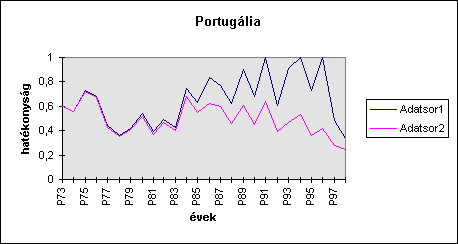 Mint látható, a hatékonyság alakulása meglehetõsen szélsõséges mintázatokat is követhet, melyek elõrejelezhetõségének vizsgálata érdekes módszertani feladatként jelentkezik, és az alkalmazás szintjén azért fontos, mert pl. a SAPARD programok/projektek monitorozandó ígérvényeinek árnyalását teszik lehetõvé (pl. a túlvállalások elkerülésével, ill. az ingadozások betervezése révén).